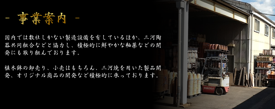 また、植木鉢の製造で培ったノウハウをもとに、植木鉢に限らず三河焼を用いた陶製器の新商品開発も行っており、オリジナル製品のご相談も随時承っております。